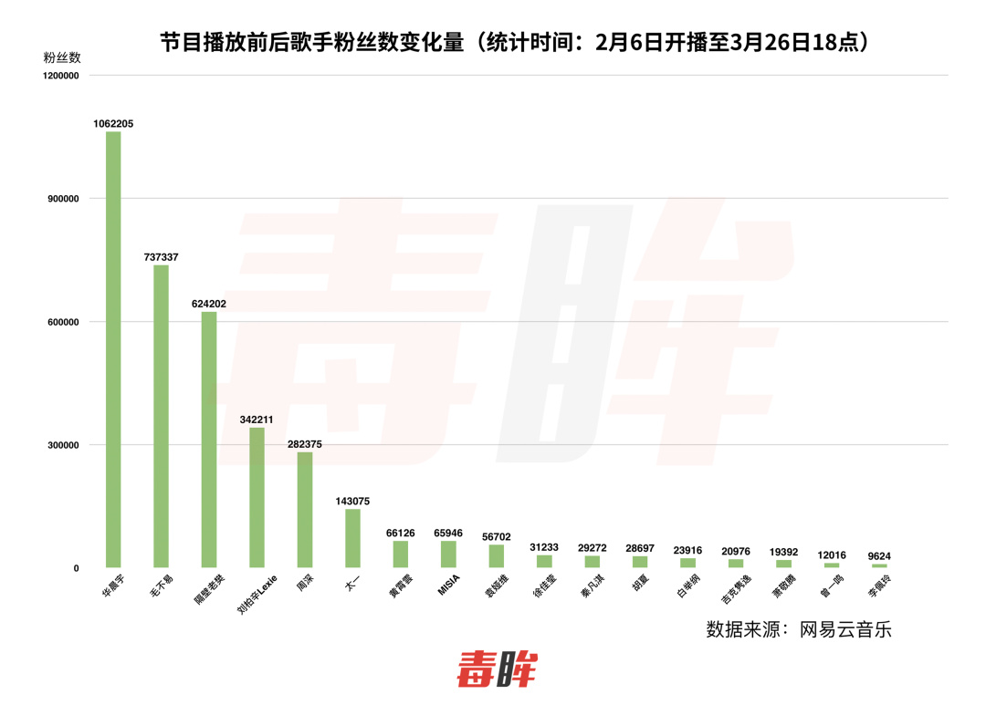 毛不易能在这个舞台上有这么久的回响,体现了唱作型歌手作品的生命力——余味悠长让人念念不忘。从网易云音乐的数据来看:第一期毛不易《借》一周播放量超700万,平均每天都有上百万播放。网友用《借》作背景音乐发布视频《致敬所有疫情前线工作人员!》,在网易云音乐播放量超过1600万。而节目播出至今,在所有参赛歌手中,他的网易云音乐粉丝涨幅中仍排在第二位,仅次于华晨宇。