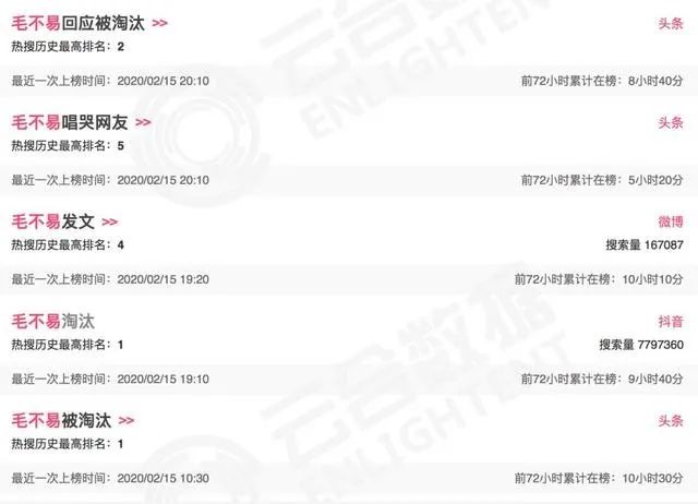 淘汰当期节目播出的2月14日,#毛不易淘汰#就登上微博热搜第一,在网易云音乐上“一荤一素”(其第二首竞演曲目)、“毛不易”也登上了平台热搜榜第一、三位,歌曲评论一天就破了3万,夹杂着许多用户的惋惜。直到2月15日,毛不易仍在接连上热搜。