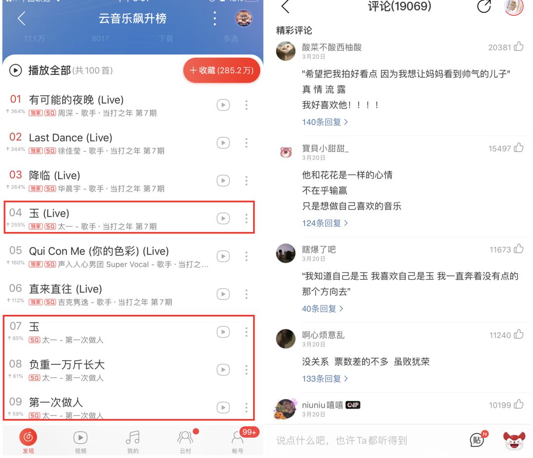 3月21日节目播出第二天,太一登上了微博热搜第17位。即使最终不敌华晨宇,他在网易云音乐上也实现了逆袭:节目播出当天,太一位列网易云音乐热搜第一;节目播出两天后,在网易云音乐飙升榜上,太一《歌手》现场版《玉(Live)》位居第四,录音室版《玉》位居第七,而与《玉》收录在同一张专辑的《负重一万斤长大》和《第一次做人》两首歌也接连上榜,位列第八名和第九名。