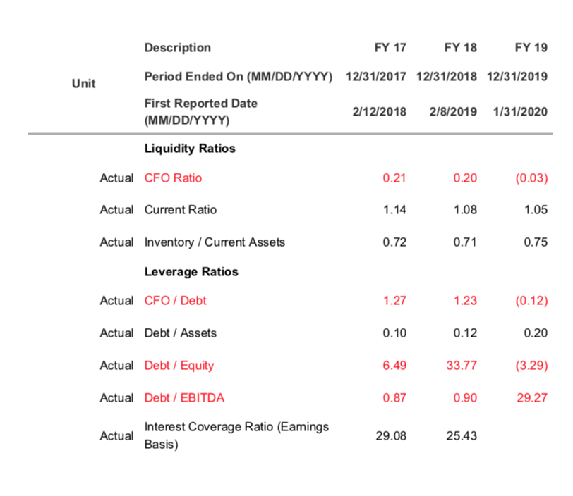 波音这几年匪夷所思的超高ROE与对应的ROA及利润率,形成鲜明的反差,背后隐藏着令人胆战心惊的经营杠杆,一旦没有源源不断的现金流来维持运营,必然会导致一系列的连锁反应——股价暴跌、评级下跌、贷款发债等募集资金困难且利率上升、债务越滚越大且被要求提前还贷,最后一幕就是公司流动性资产耗净、公司倒闭或者债务重组。