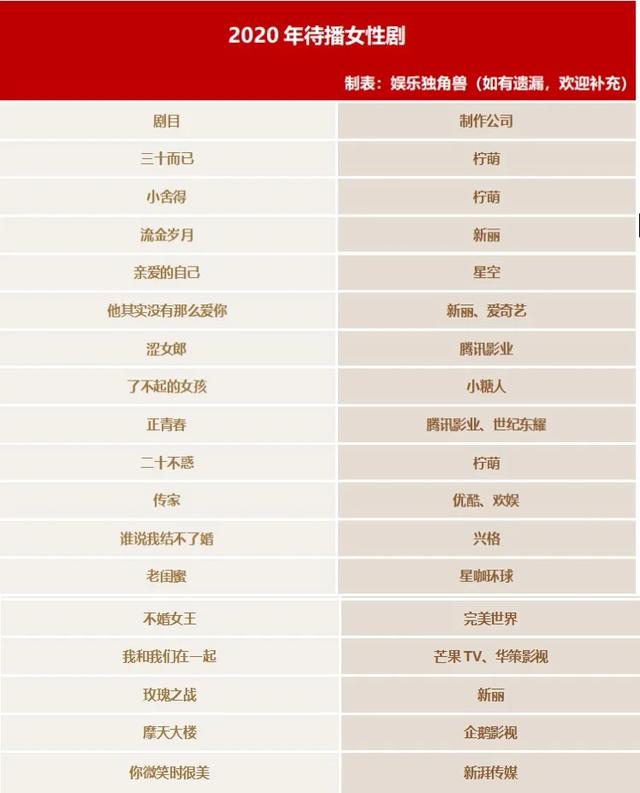 显然,头部公司早已看上了女性剧的社会意义和受众潜力,新丽、华策、柠萌、欢娱、腾讯影业、小糖人、完美世界等公司均开始大力布局相关内容。经历了2019年的筹备,2020年有超14部女性剧待播。
