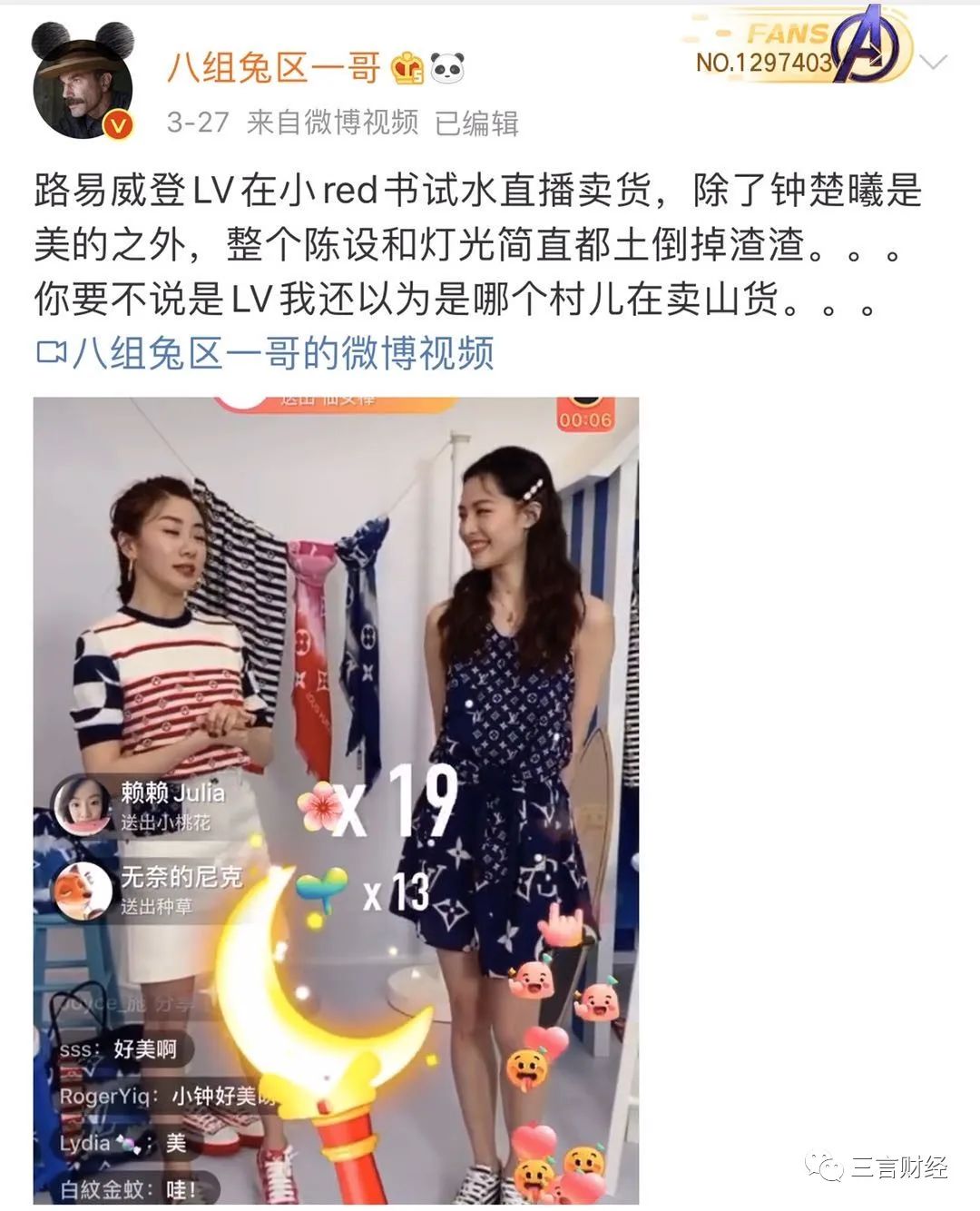 “路易威登LV试水直播卖货,除了钟楚曦是美的之外,整个陈设和灯光简直都土到掉渣渣...你要不说是LV我还以为是哪个村儿在卖山货。”