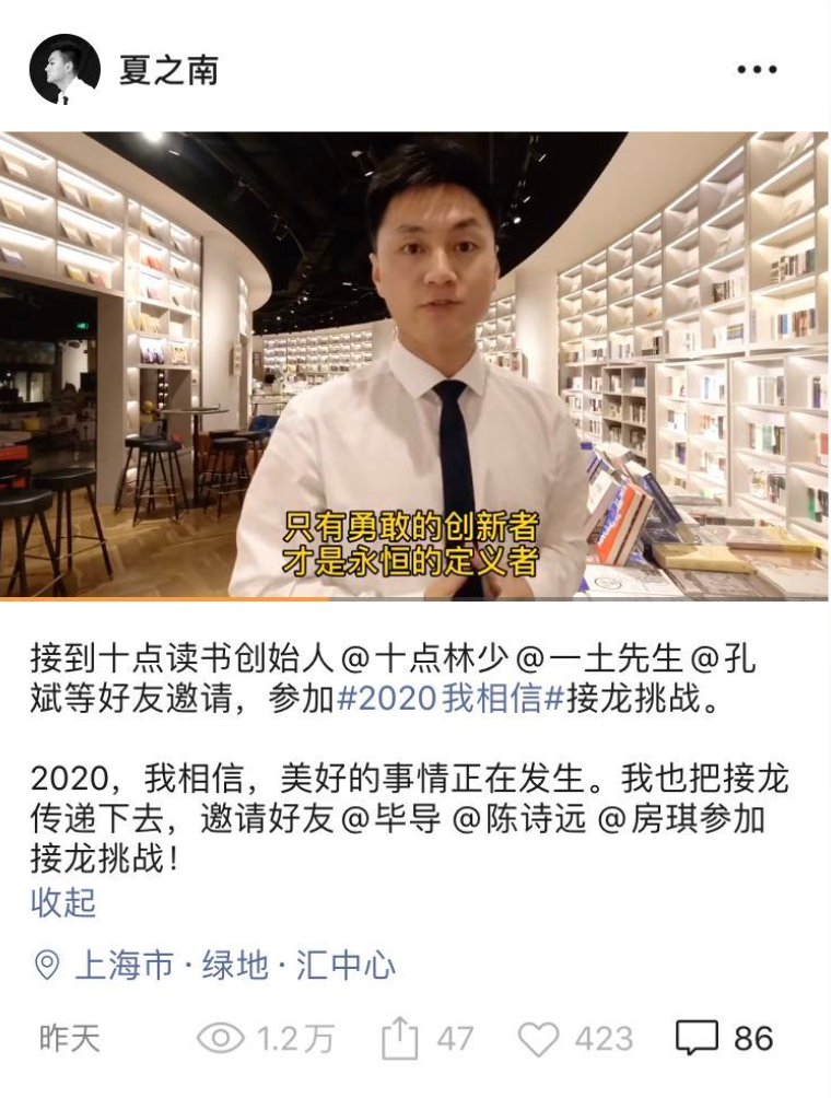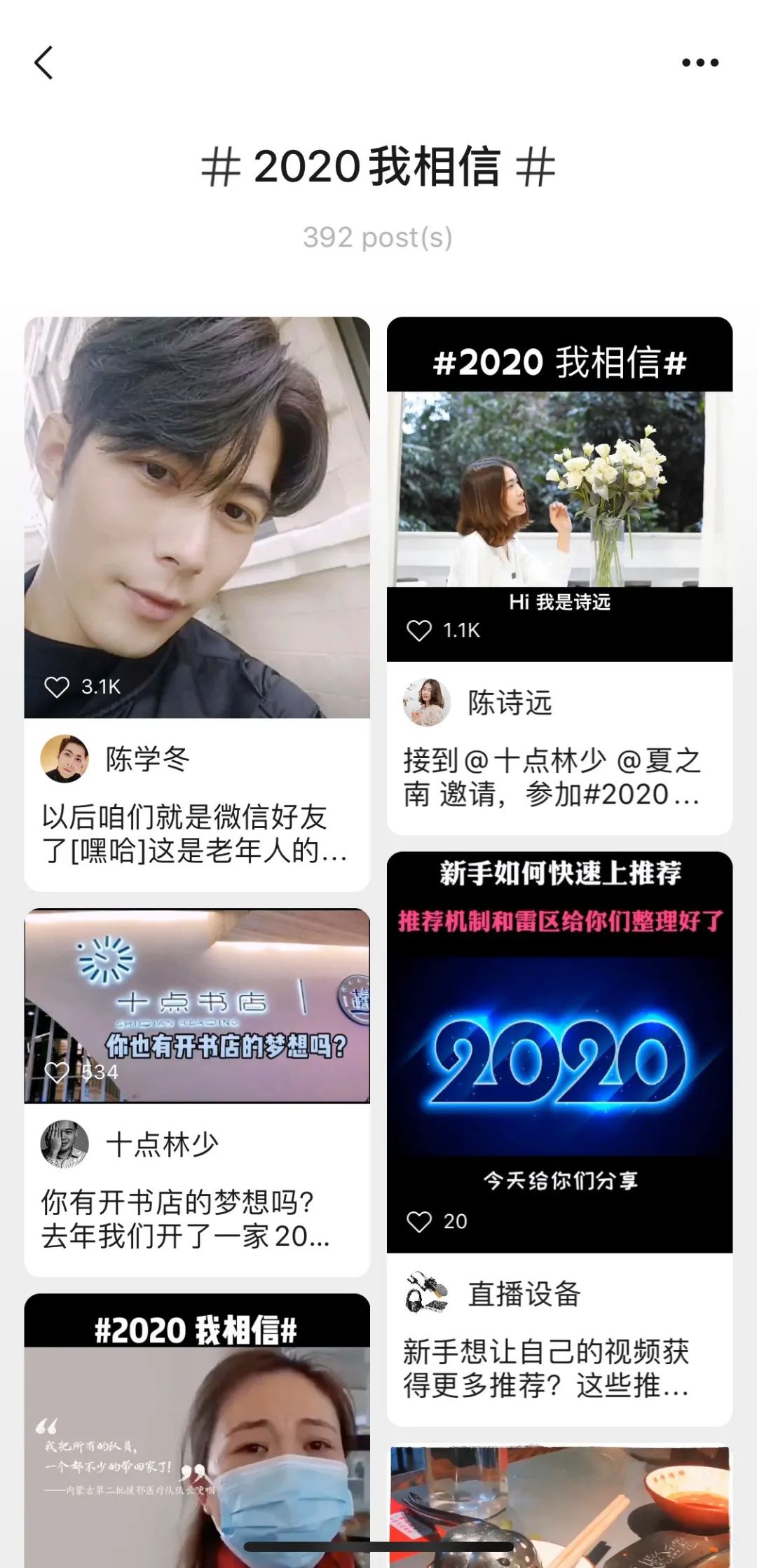 在视频号#2020我相信#的话题页面,有近400条相关视频。各界人士以点名接龙的形式表达了各自对2020年的期许和愿景。自发参与话题接龙的包括杨天真、吴晓波频道、十点林少、陈诗远这样的业内外的名人大V,连刚开通视频号的陈学冬也被这个标签吸引,虽然并未参与接龙活动,也为话题贡献了一波流量。