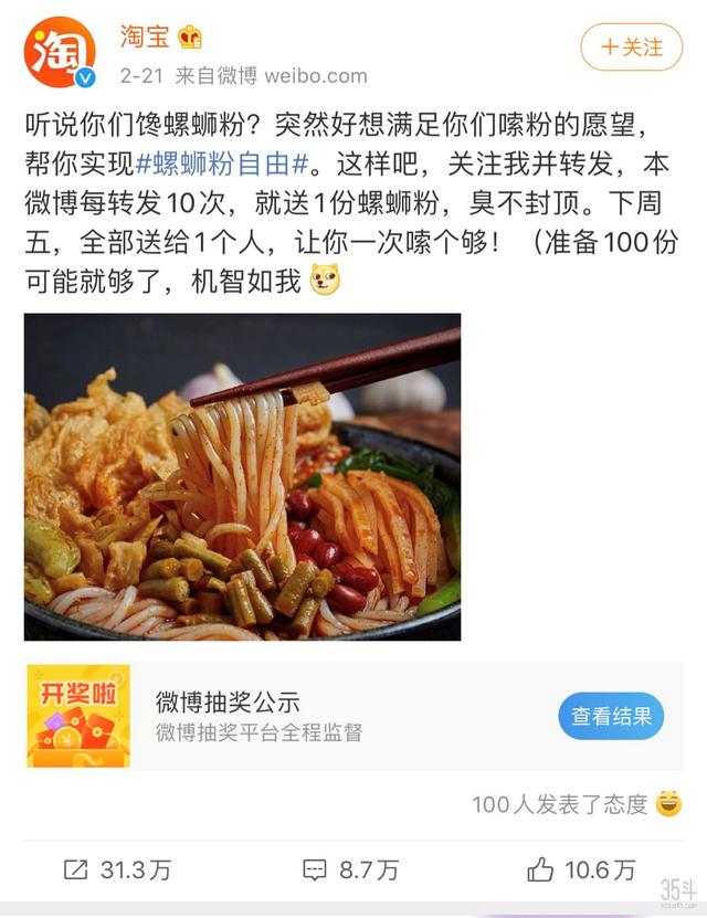 2月21日,淘宝专门发博称要帮粉丝实现#螺蛳粉自由#,转发10次即可送一份螺蛳粉,臭不封顶。短短几天,这条微博的浏览量超过1600万,分享31万次,也就意味着淘宝需要送出3.1万份螺蛳粉。