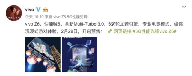 2月25日,在推出2020年首款5G性能旗舰机iQOO3的同时,vivo通过官方微博宣布,vivo Z6于2月29日开启预售。售价最低2198元起的vivo Z6,是vivo打开低价市场,并推动5G终端价格普及和渠道下沉的重要产品。