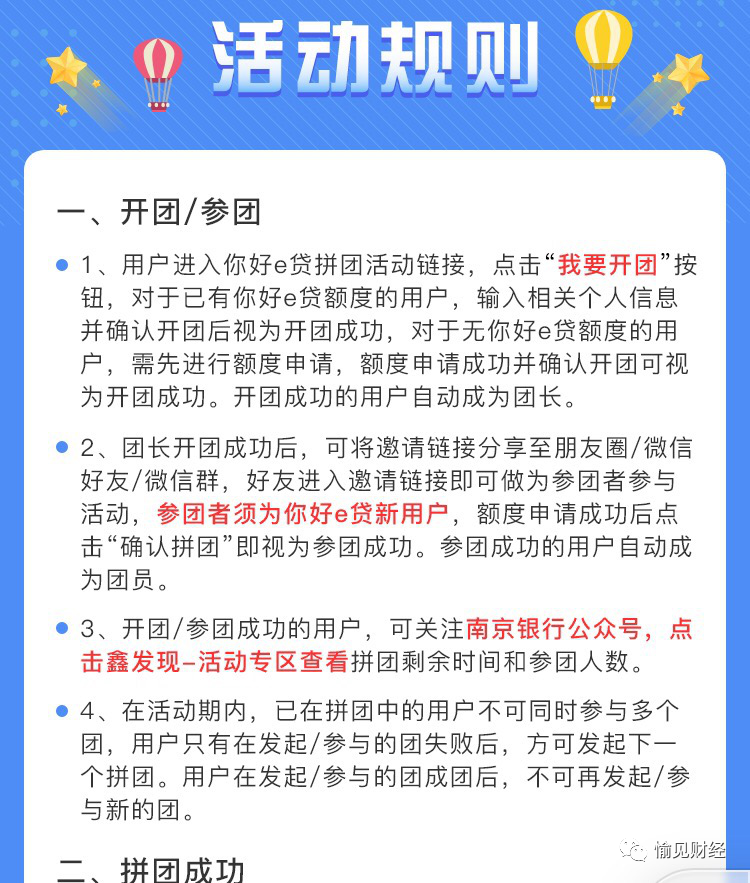南京银行“你好e贷”拼团活动规则中明确,“参团者须是‘你好e贷’新用户”。