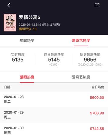 十年IP的成长之路落幕,爱奇艺推出的《爱情公寓5》掀起话题无数,猫眼专业版数据显示,虽然该剧最高热度是1月14日的9849,但是开通超前点播的1月28日及之后两天热度值达到9700+,较之前后两周效果显著;在爱奇艺站内,该剧的最高热度9656稳稳落在了1月29日,不难推测超前点播是利好元素。