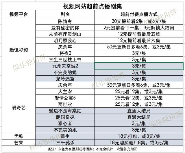 率先入局的腾讯视频、爱奇艺也在今年加速布局了这一板块。据不完全统计,今年以来,腾讯视频便有《将夜2》《三生三世枕上书》《九州天空城2》三部超前付费点播剧集,爱奇艺亦有《爱情公寓5》《大主宰》《两世欢》《鬓边不是海棠红》《民国奇探》《猎心者》六部剧集尝试了这一模式。