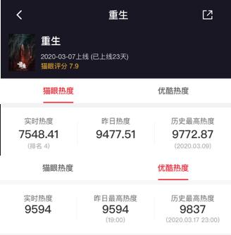 《重生》的特殊意义毋庸再次强调,作为优酷入局超前点播的试水之作,背负着平台的期待。只是从其刚刚在周四开通超前点播来看,效果并不十分显著。从猫眼专业版数据来看,无论是猫眼热度还是优酷站内热度,该剧的最高热度值都停留在剧集上线前期,而超前点映虽有带来热度回升,但声量有限。