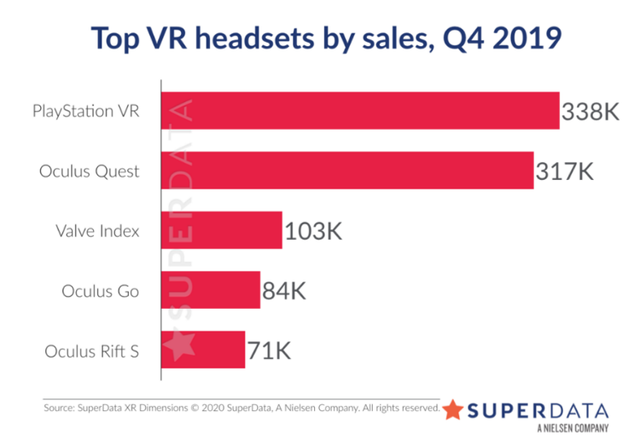 根据尼尔森旗下SuperData发布的报告显示,由于HTC官方没有公布HTC Vive的具体销量,所以PlayStation VR和Oculus Quest成为2019年最畅销的VR头显设备。但即便是销量排名前两位,索尼(VR块面)和Oculus的销售额也出现了约42.5%的降幅。数据显示,在2019年第四季度,排名前五的VR头盔总共只售出了91.3万台。