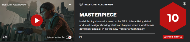 这是知名游戏媒体IGN对《半衰期:Alyx》做出的评价,同时IGN更是直接为其打出了10分满分。