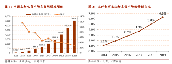 2019年生鲜电商渗透率仅为6.3%,随着技术的更迭和消费者线上购买生鲜的习惯培养,以及此次疫情的叠加影响,生鲜电商的渗透率有望加速上行。