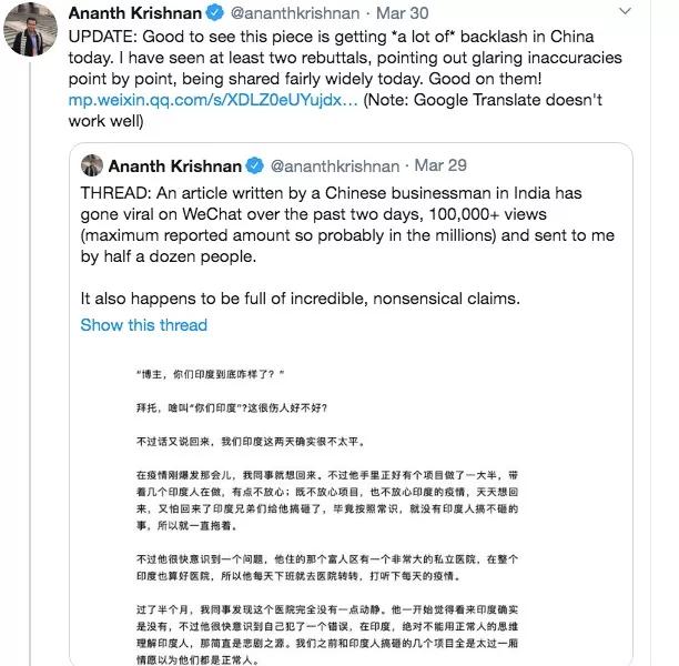 不过,国内网友的反应,尤其是来自两位在印度生活的华人的反驳,部分淡化了“九边”在墙外的恶劣影响。阿南什·克里斯南还将其中一篇转到他的Twitter上。