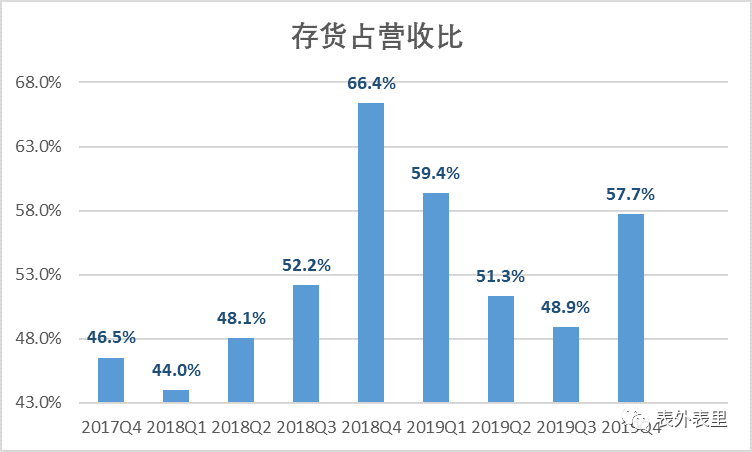 根据小米财报,2019Q4其存货同比增长了10.5%,占营收比上升至57.7%。可以发现,与研发费用占营收比的增长规律相似,同样是从2018Q4开始,小米的存货占营收比迅速增加。