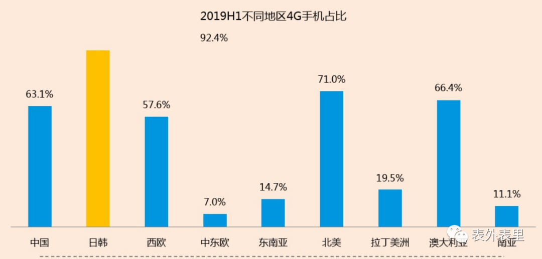 根据统计,截止2019H1,日韩地区4G普及率最高,占比超过九成、其次为北美(71%)、澳大利亚(66.4%)和中国(63.1%)。而西欧的4G手机占比为57.6%,仅相当于中国2016年的普及水平,正处于4G的高潮阶段。而东南亚、南亚的4G渗透率均不超过15%,仍处于普及阶段。