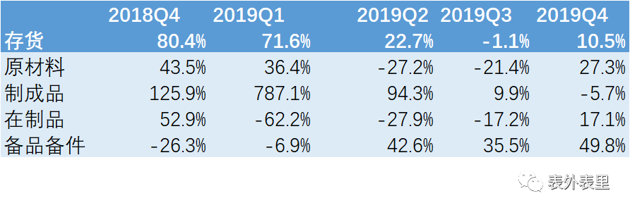 而在存货结构中,很明显的是,制成品同比增长从2019Q1开始迅速下降,Q4甚至负增长5.7%。同时,原材料、在制品、备品备件2019Q4的同比增长数据较前几个季度均在上升。