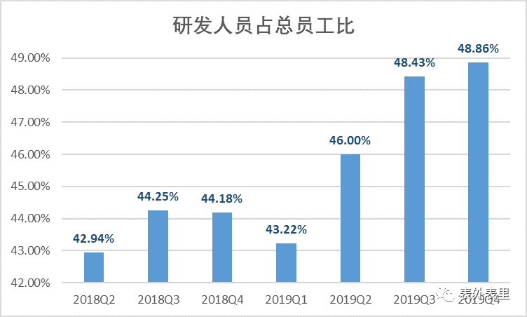除了在研发层面花更多钱,小米还雇用了更多的研发人员。截止2019Q4,小米有8848名研发人员,占总员工比为48.86%,是7个季度以来的最高水平