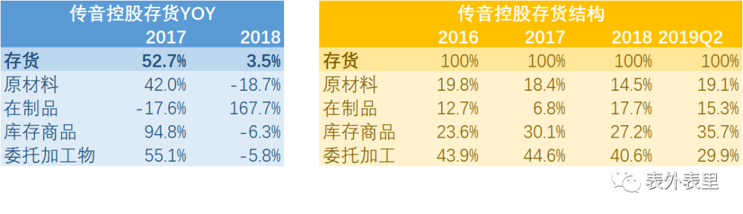 再看传音详细的存货情况,与小米存在很大的差异。从存货同比增长看,传音的在制品(即生产过程中的半成品手机)存货于2018年激增,涨幅达到167.7%,其余原材料、库存商品和委托加工物(委托外部厂商加工的原材料或者半成品)的占比都在下降。从存货结构看,传音2019Q2涨幅最大的是库存商品,此外在制品和委托加工品都有所下降。