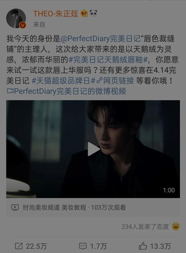 2018年8月,完美日记选择了男团NINE PERCENT成员朱正廷为唇妆代言人,官宣微博转发量达到100万。品牌官博时常和代言人亲密互动,像粉丝一样为其打榜送花,还在微博抽奖送粉丝演唱会门票等,进一步加深了品牌和粉丝的连接。朱正廷当前微博粉丝1474万,4月1日中午在微博发布了完美日记新品唇釉的视频广告,转发量迅速达到22.5万,点赞数13.3万。