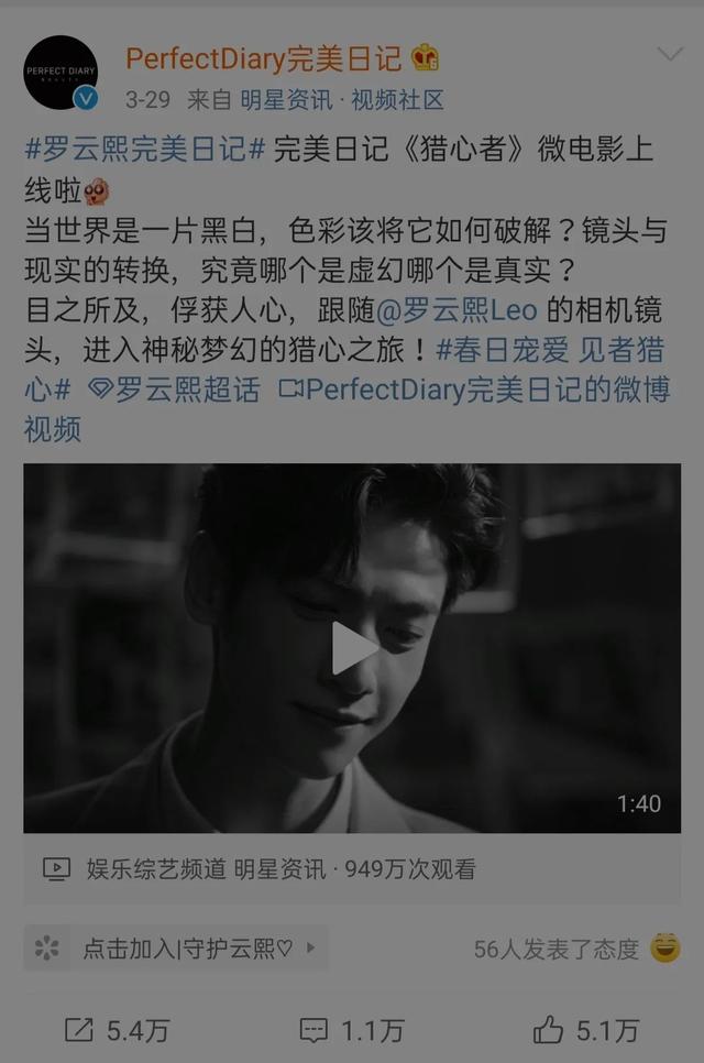 3月底,完美日记趁热打铁,延续了之前的思路,官宣演员罗云熙为色彩代言人,还拍摄了微电影《猎心者》,被粉丝评价为“实力宠粉”。