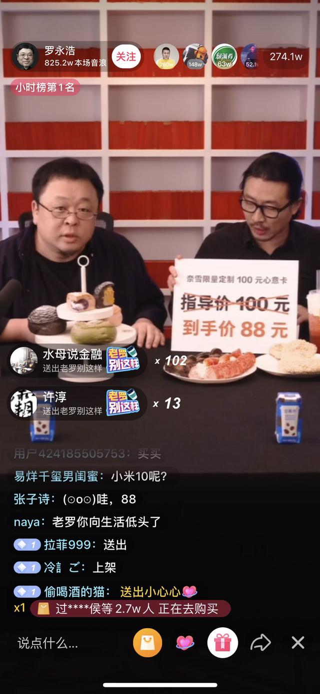 按照老罗自己的说法,直播频率将会是“初期是周播,然后是一周三播,最后是日播。”3351.2多万音浪折算后,按照分成比例老罗能够分到约82万。在首次直播中,不太熟悉礼物机制的老罗和另一个人一起直播,旁边有人鼓掌和回答,邀请昔日对头小米高管担任嘉宾发红包,创造热烈互动气氛,一边“说相声”一边手持文字说明板讲解。“倒数三二一”之后跳转淘宝店,价值100元、售价88元的奈雪的茶心意卡销量1万+,上架秒光。