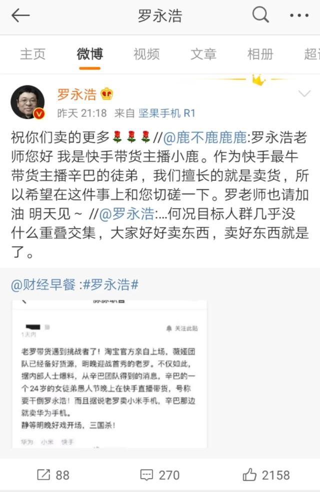 就在罗永浩直播前一天,一位自称“快手最牛带货主播”辛巴徒弟的主播“小鹿”在微博向罗永浩喊话称,“我们擅长的就是卖货,希望在这件事上和您切磋学习一下,明天见~”。