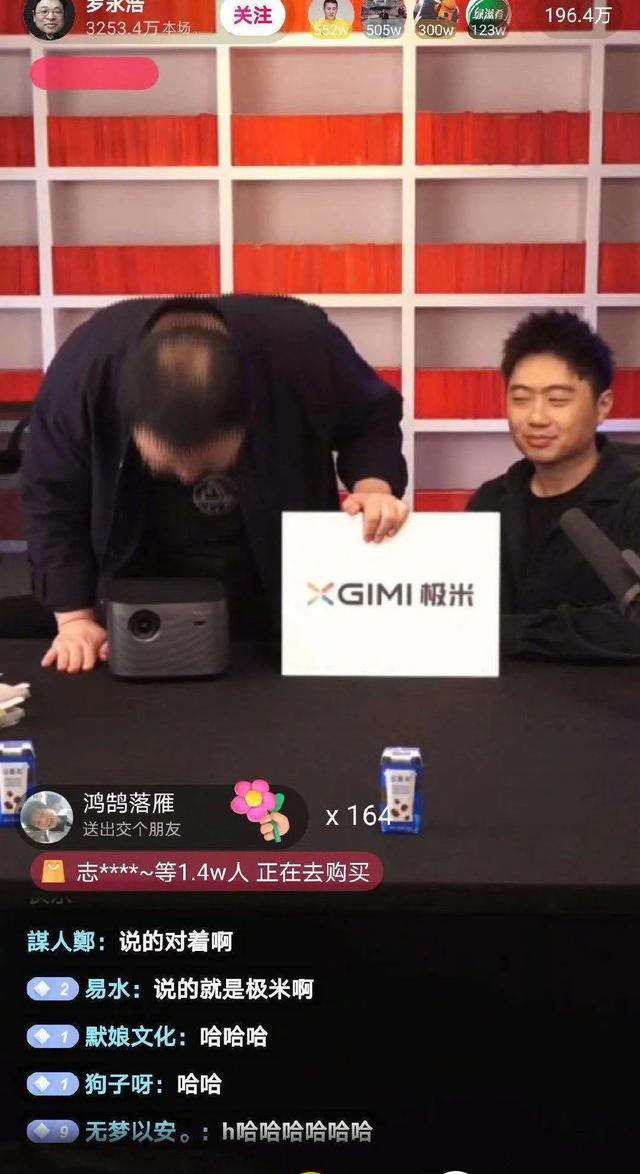 直播中,罗永浩站起来鞠了一躬,稀疏的头顶尽数暴露在镜头前,他是在向极米投影仪道歉,原因是在直播中说错了品牌的名字。
