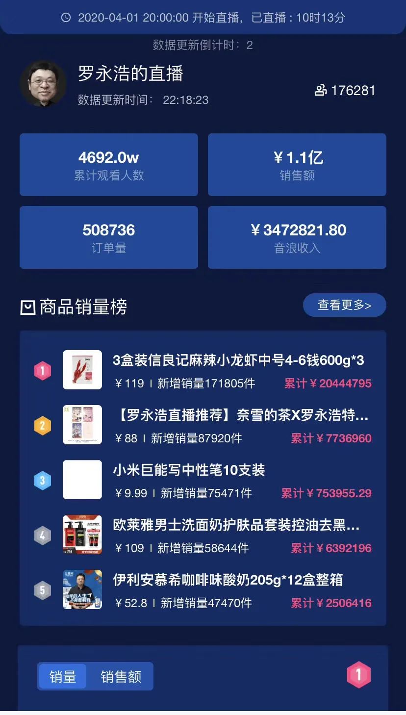 老罗也乘上了这股东风,直播两小时,销售额就达到1.1亿,卖得最好的是麻辣小龙虾。