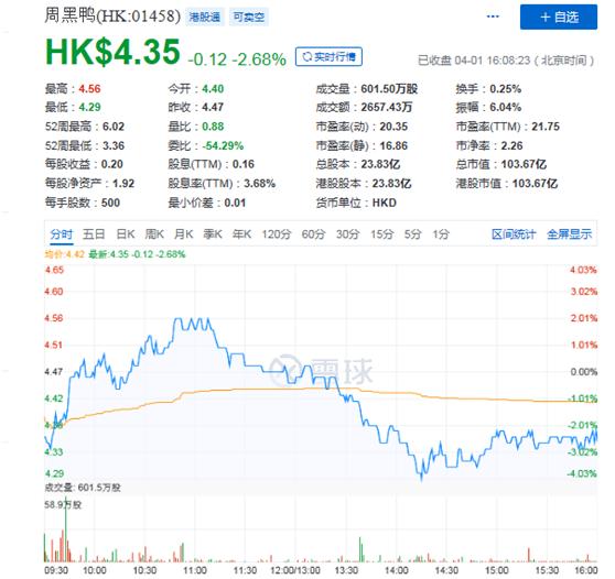 3月31日晚间,周黑鸭公布了其2019年的全年业绩报告。从财报来看,周黑鸭全年营收和净利润均同比下滑,门店扩张受阻、总销量也在持续下滑。表现在资本市场,对这份财报似乎也并不是那么满意,4月1日周黑鸭股价以2.68%的跌幅收盘,报4.35港元。