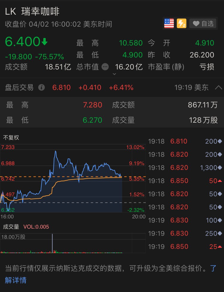报告发出后,瑞幸咖啡股价一度暴跌至85%,从昨日收盘价26.2美元一路断崖式下挫至4美元。截至收盘,瑞幸下跌75.57%,报6.4美元,日内盘中8次触发熔断。