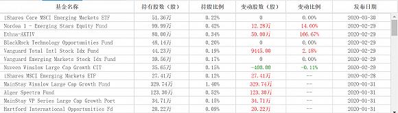 贝莱德旗下的多只基金也持有瑞幸咖啡,包括BlackRock Technology Opportunities Fund、BlackRock Science & Technology Trust II及两只ETF产品iShares Core MSCI Emerging Markets ETF、iShares MSCI Emerging Markets ETF,合计持有175.7万股,占比0.75%。其中BlackRock Science & Technology Trust II在去年末大幅加仓4.21万股。