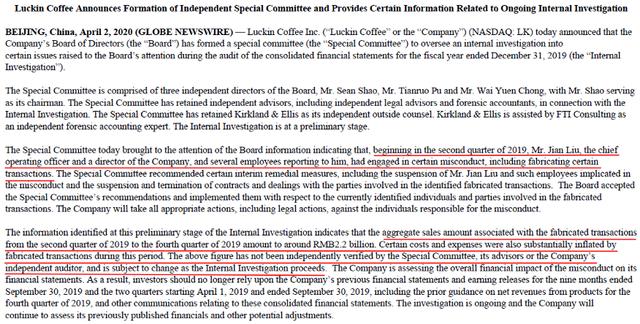 公司在事成定局的情况下,只能自己发布公告承认存在严重的造假行为。而就在瑞幸发布以上公告前的几天,公司最早期投资人兼公司董事刘二海辞去审计委员会委员职位,其在公告中给出的原因是由于美国证券法要求,公司在上市12月后,审计委员会委员必须是由非独立董事担任,而刘二海是公司独立董事。