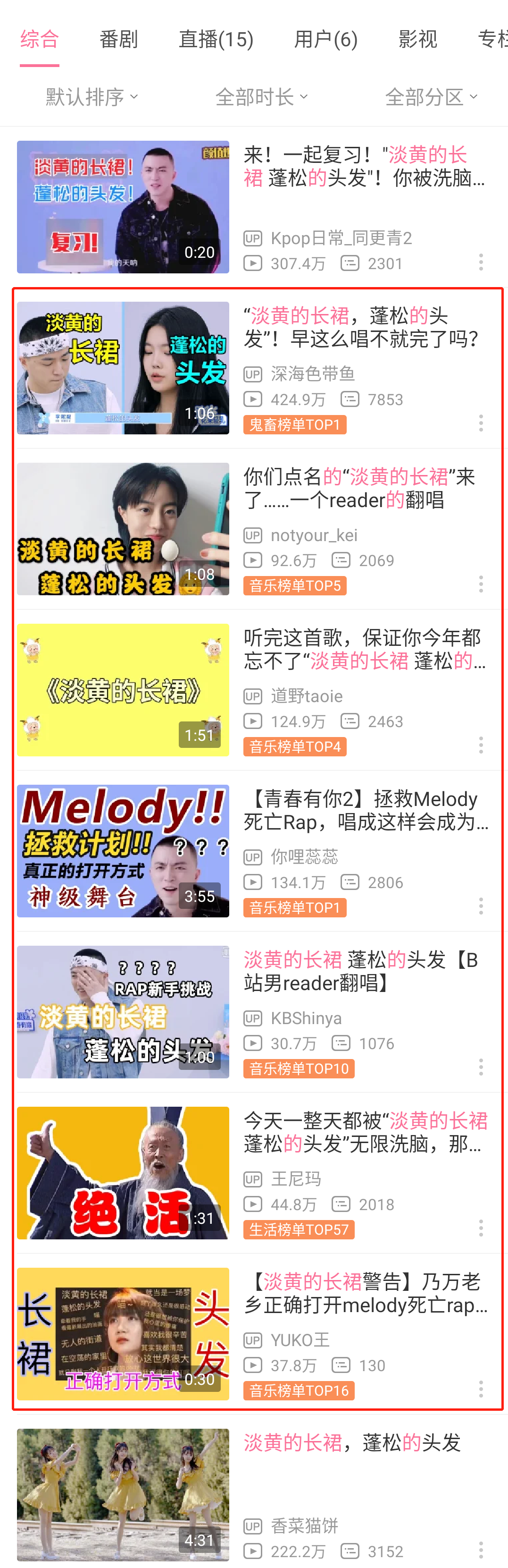 集“二创视频”之大成的B站(哔哩哔哩动画),自然没有逃过被“淡黄的长裙”支配的恐惧。B站热搜榜中,“淡黄的长裙”位列第三,相关创作视频曾霸榜时尚、音乐、鬼畜、生活区甚至全站榜单。