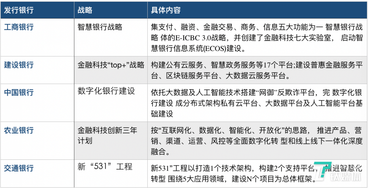 事实上,2017年以来,几乎所有银行都在提金融科技战略,并投入真金白银加大金融科技团队建设,或成立金融科技子公司。灵活的股份制银行如招行、平安、兴业是其中的佼佼者,但六大行也在去年纷纷成立金融科技子公司——工行有工银科技、建行有建信金科、中行有中银金科、交行有交银金科。