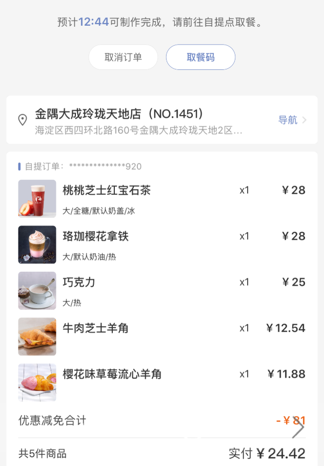 记者在前往门店途中,在瑞幸咖啡 APP 上下了自提订单,下单时间显示为10:50,下单后取餐时间显示为“预计 12:44 可制作完成”。