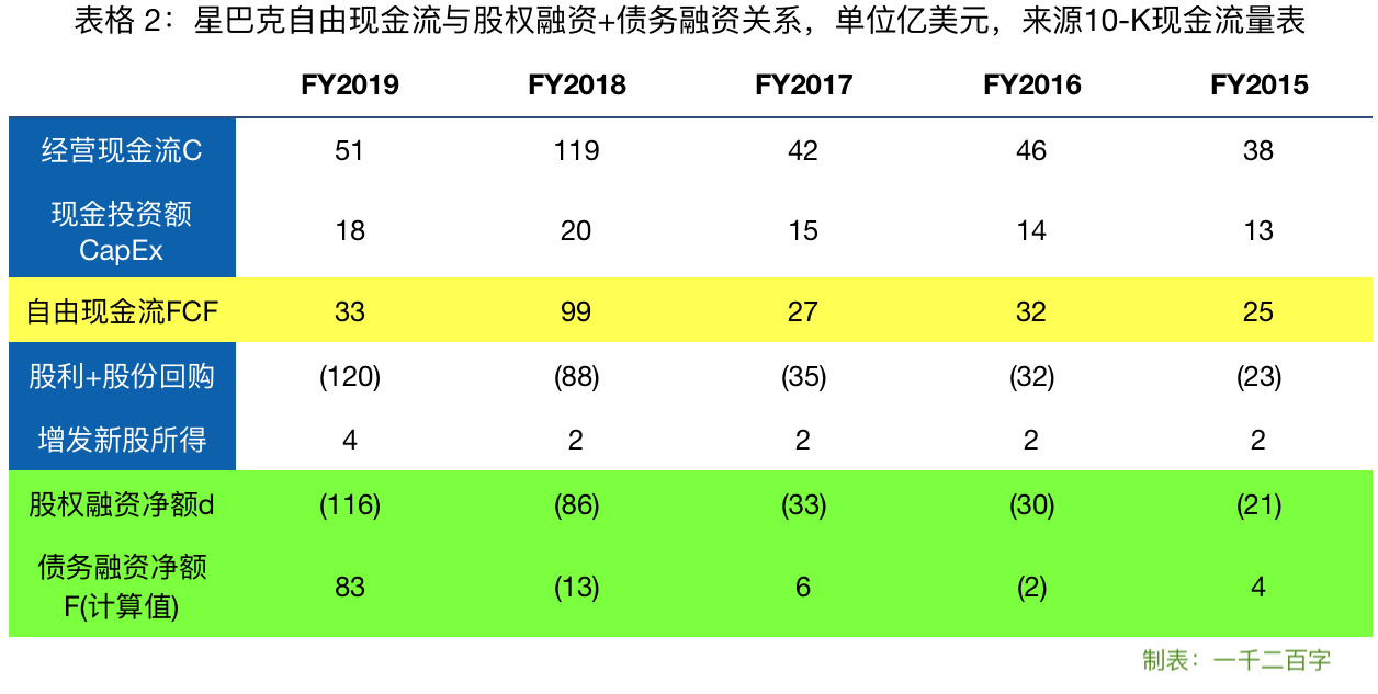 再来看近五年,上面这张表2实际上是对星巴克现金流量表的重构(比较粗略),括号表示现金的流出。我们平时看到的财报中的现金流量表一般是按照经营活动、投资活动、融资活动三部分列报数据的,但这种划分方法将企业对股东和债权人(比如银行)的现金流动情况混在了一起;