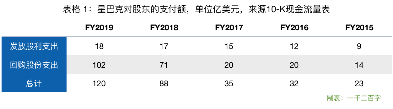 星巴克从2010财年开始派息发放股利,当年发放1.7亿美元,至今已连续发了10年;而股票回购更早,至少是从2001财年开始,当年用于回购股票的现金支出近5000万美元,但它不是每年都回购,大部分年份有回购。