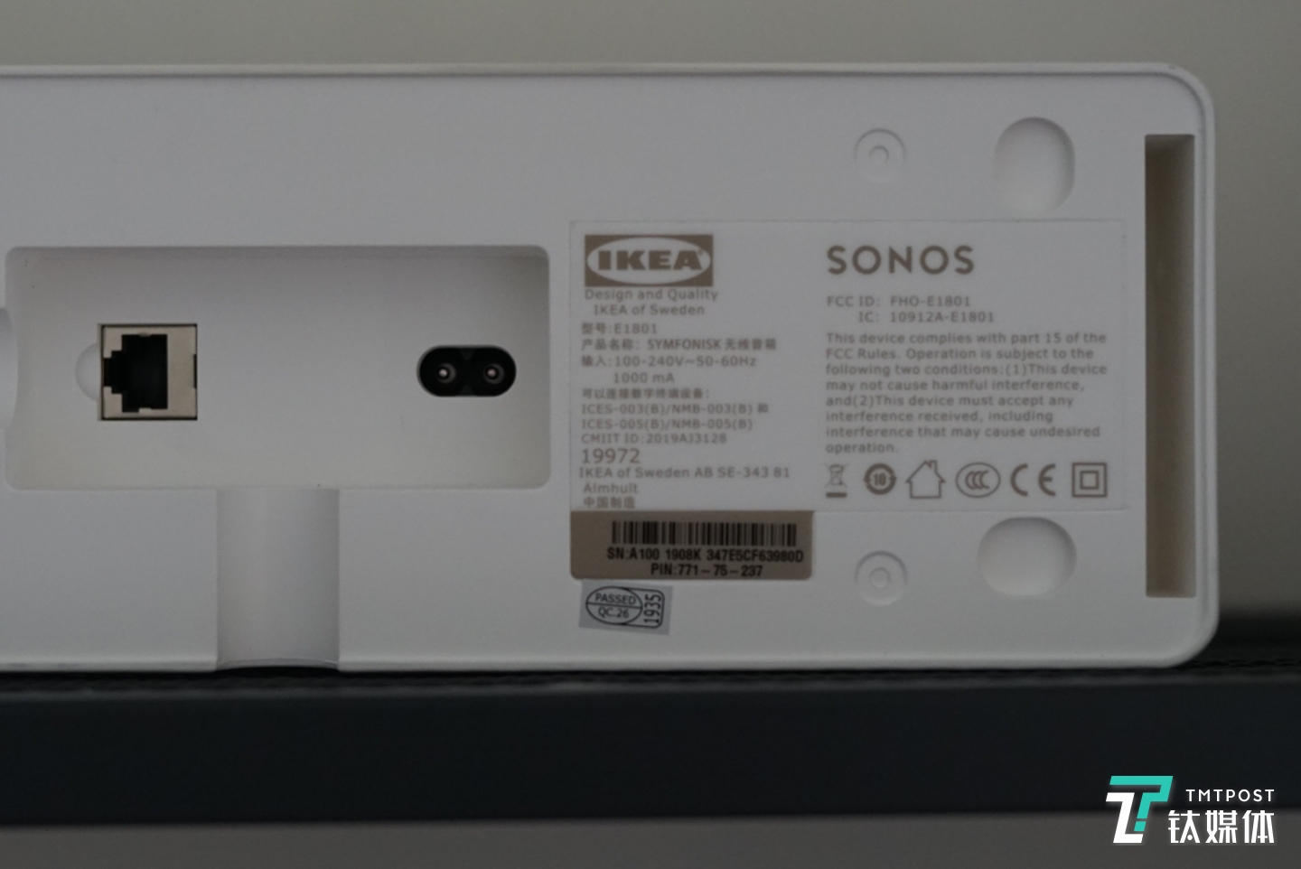 Sonos产品标志性的三枚实体物理按键被放置在了底部的位置,分别为播放/暂停键和音量加减键,电源接口则被设置在后方,并且有一个隐藏的凹槽设计,避免过多的电源线裸露在外,这能在一定程度上保证视觉美感。