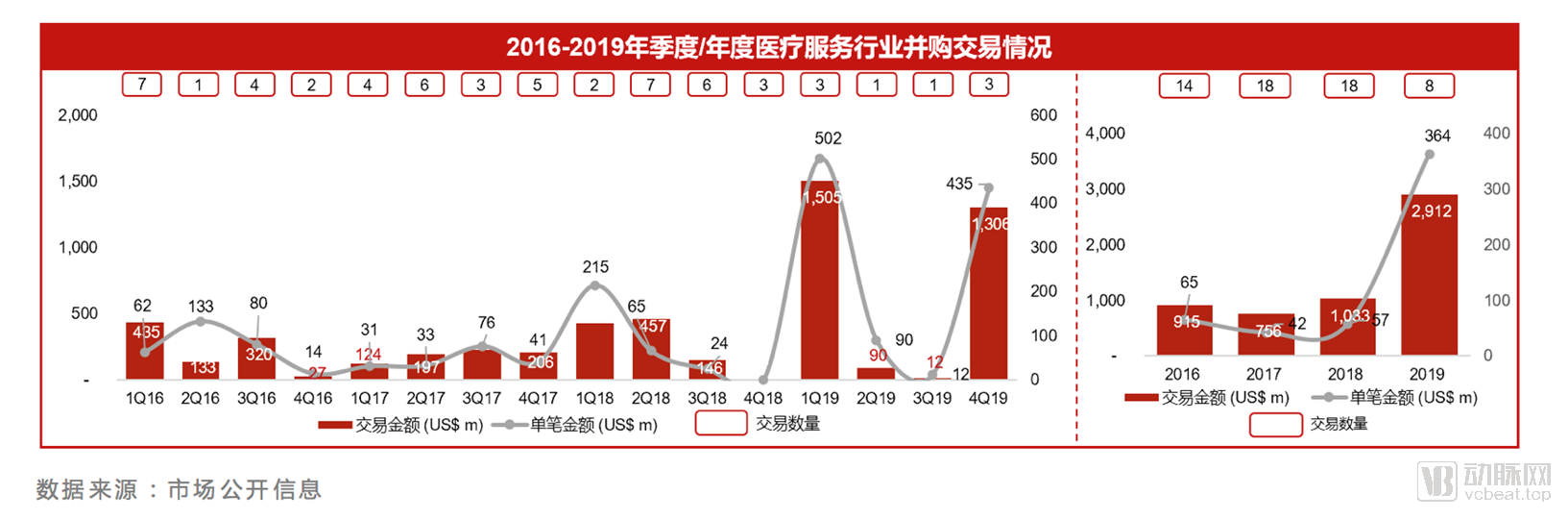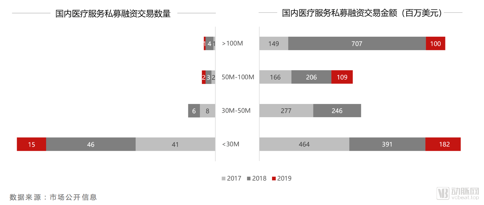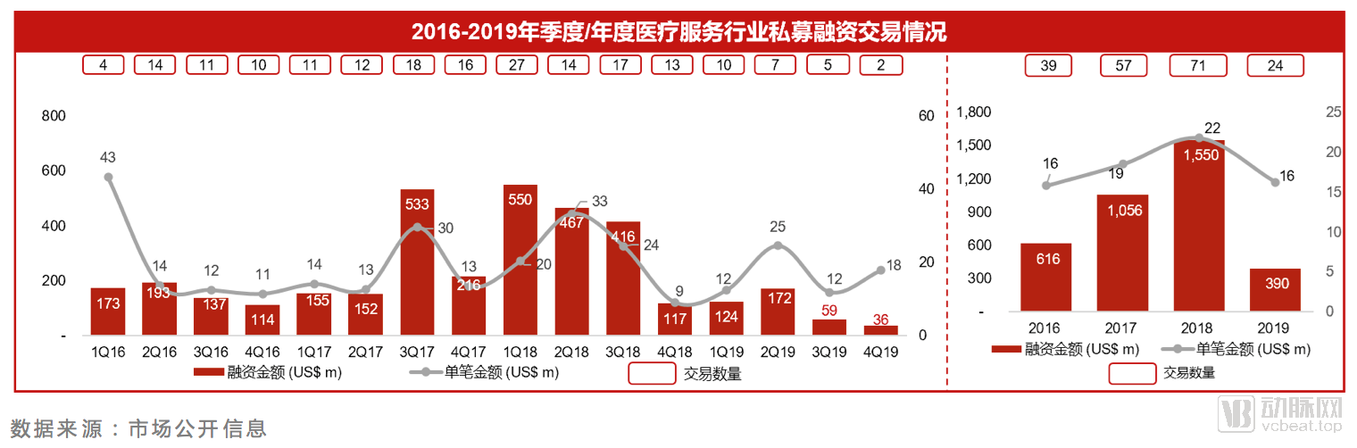 医疗服务私募融资继2018年下半年走低之后,在2019年再创新低,交易数量和金额都有收缩。