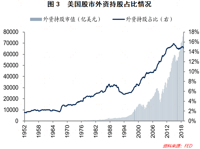 我们再来看全球最发达的资本市场——美股的情况。国际化程度最高的美国股市从建立之初就是完全开放的。从美国股市的外资流入情况来看,外资持股占比逐年提升,从1951年底的1.7%大幅上升至 2018年底的14.8%,目前外资持股占比仅低于美国家庭部门和共同基金(分别为38%和 23%),在美国股票市场中的影响越来越大。