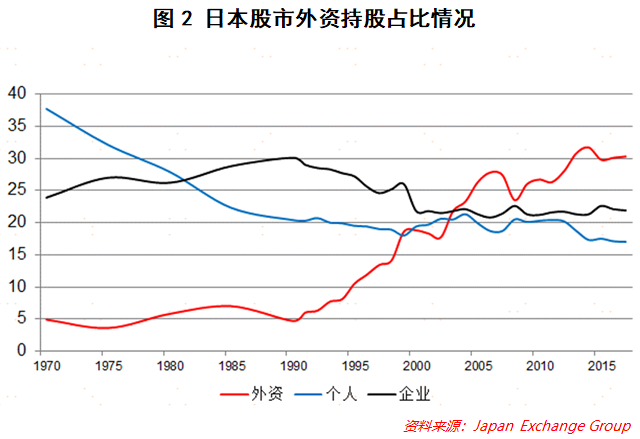 1970年开始,日本股票市场中,外资持股市值占比整体呈现上升趋势,从4.9%升至2017年底的30.3%,但近几年来,由于日本经济复苏乏力,外资净流入的意愿并不强烈。