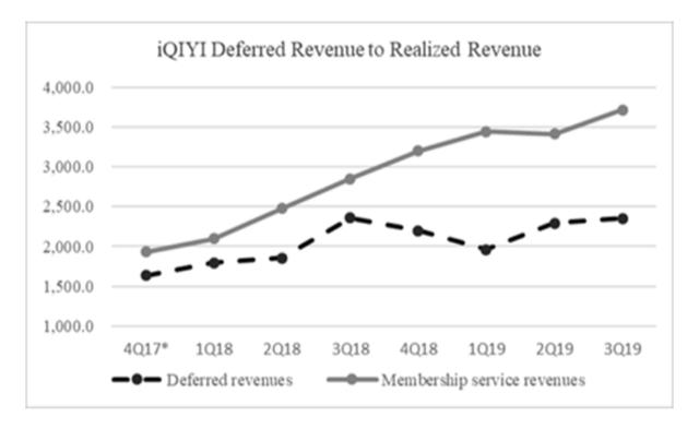 从18Q3到19Q1,爱奇艺的付费用户增加了1,610万,平均订阅期从6个月增加到8个月。然而,爱奇艺的递延收入同期下降了17%——这个数学矛盾表明这些数字中至少有一个是编造的。