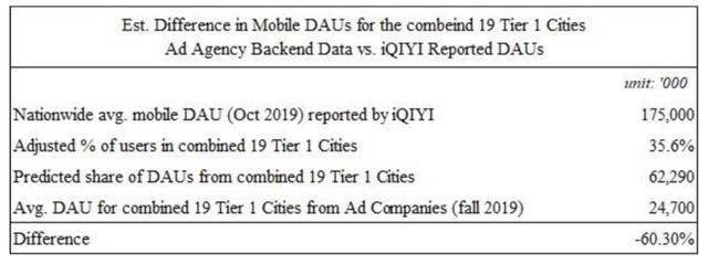 我们的研究来自三个独立来源的数据,这些数据表明爱奇艺将其DAU夸大了42%至60%。
