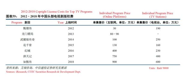 中信的报告提供了2012-2018年间版权费用最高的表格。在线和电视广播的顶级节目的许可费逐年增加,直到在线和电视之间的溢价比率在2017年达到1.88倍的峰值。是2018年的逆转,溢价下降了20%至1.5倍。