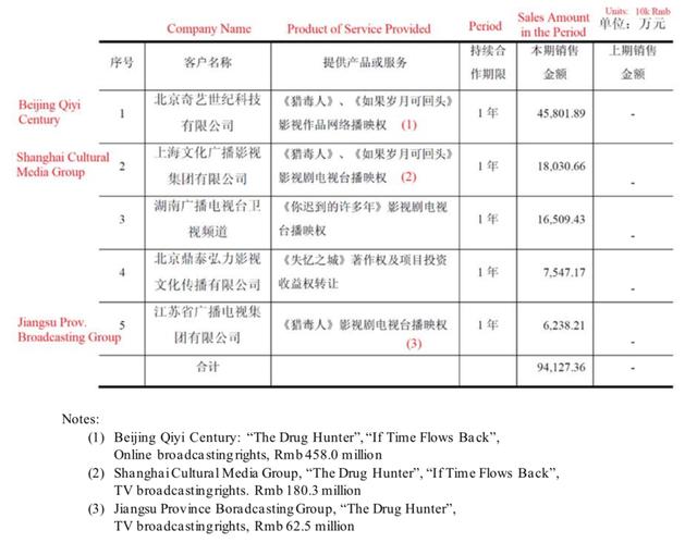 爱奇艺的子公司Beijing Qiyi Century是当代明诚在2018年影视媒体领域的最大客户。当代明诚的公开披露显示,爱奇艺为这部电视剧《如果岁月可以回头》付出了高昂的溢价。当代明诚透露,2018年影视收入中的人民币4.580亿元来自爱奇艺。所有这些都来自出售两个标题的在线广播权:《如果岁月可以回头》和《毒猎人》。以下摘录自当代明诚的2018年度报告,按收入列出了前5名客户: