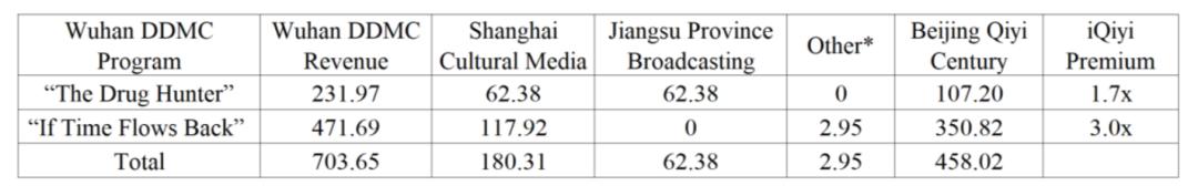 爱奇艺为《毒猎人》支付的价格似乎也高于市场价格。当两个或多个电视台一起播放一个节目时,它们通常会支付相同的费率。将此成本分摊公式应用于当代明诚的这两个节目的总收入以及每个客户的报告收入,我们发现爱奇艺为这两个节目支付了巨额溢价。如果上海文化传媒和江苏省广播电视台都为《毒猎人》支付了6.24亿元人民币,我们估计爱奇艺支付的费用是电视价格的1.7倍。