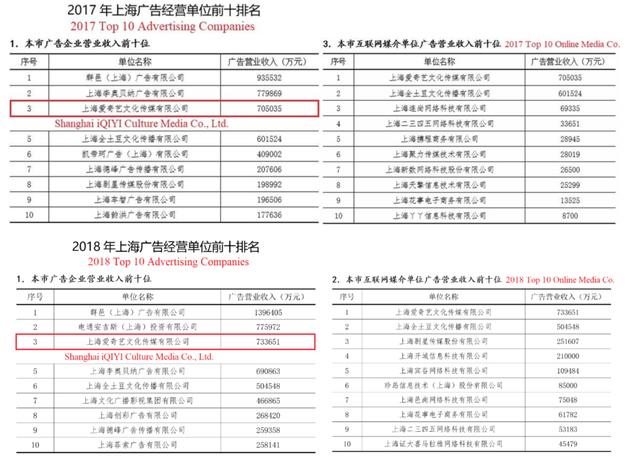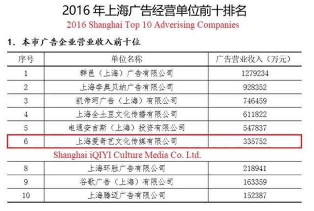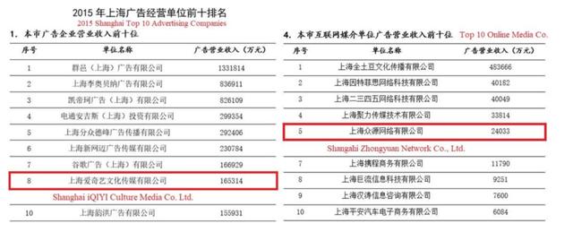 爱奇艺的主要广告公司是上海爱奇艺文化传媒有限公司,简称“上海爱奇艺”。爱奇艺的二级广告公司上海中原网络媒体有限公司(“中原”),负责爱奇艺独立的直播广告业务。2015年,根据上海工商总局披露的信息,这家公司的广告收入位列在线媒体公司前十。