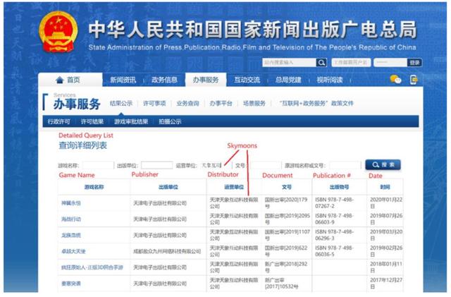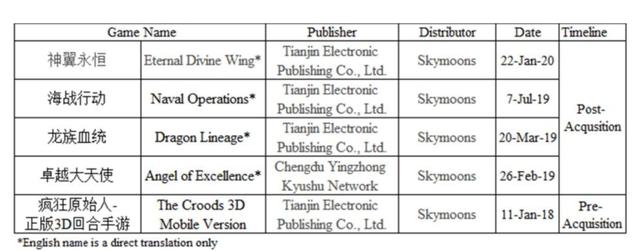 我们对中国版权记录的调查显示,自2018年7月收购以来,天象互动尚未注册任何新的出版物版权。相反,我们只找到了4个游戏的发行权,其名称均由其他游戏公司许可: