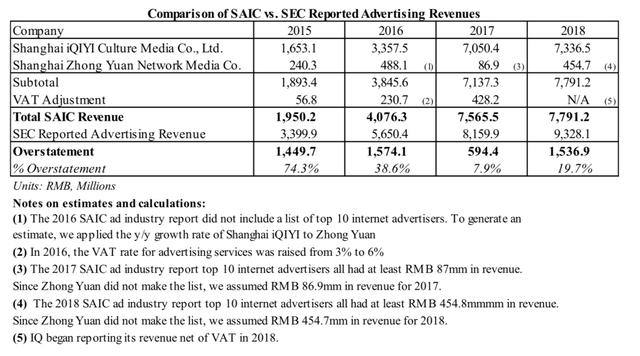 上海市政府基于上海工商总局报告的广告收入,发布了广告公司的排名报告。根据2015-2018年的报告我们得出结论,爱奇艺SEC文件披露的2015年至2018年间累计广告收入多报了人民币51.55亿元。因为我们在没有可用数据的情况下使用了最有利于爱奇艺的估计方式,所以我们认为实际的虚报远远大于我们的估计。