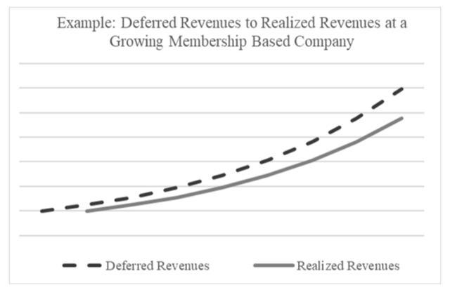 下图是一个示例,表明我们期望看到管理层的说法是否属实。由于订户为将来要交付的服务支付更多的前期费用,因此递延收入曲线始终领先于已实现收入曲线。